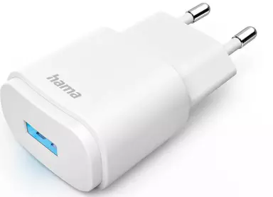 Ladeadapter for strømforsyning av smarttelefon via stikkontakten. Maks. ladestrøm på 6 W for hurtiglading. LED-funksjonsindikator gir informasjon om enhetens status.