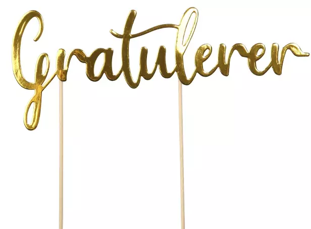 En dekorativ kaketopp med teksten «Gratulerer» i gull.